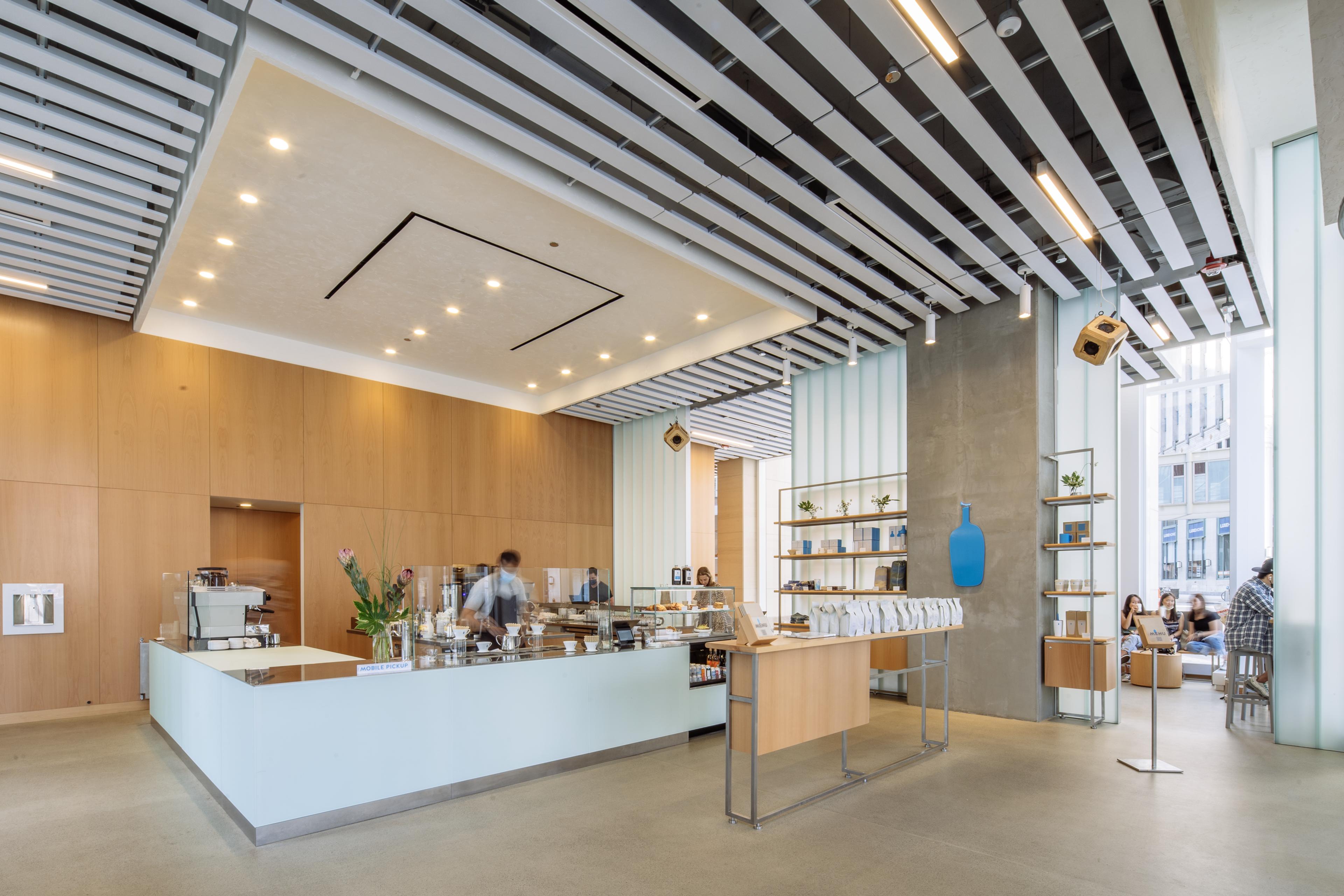 Custom and Slab baffles cover the ceilings of this Chicago Blue Bottle to define its dining area. The ceiling baffles keep the bustle of the city out and provide a quiet space for customers to enjoy a caffeine boost and work undisrupted.