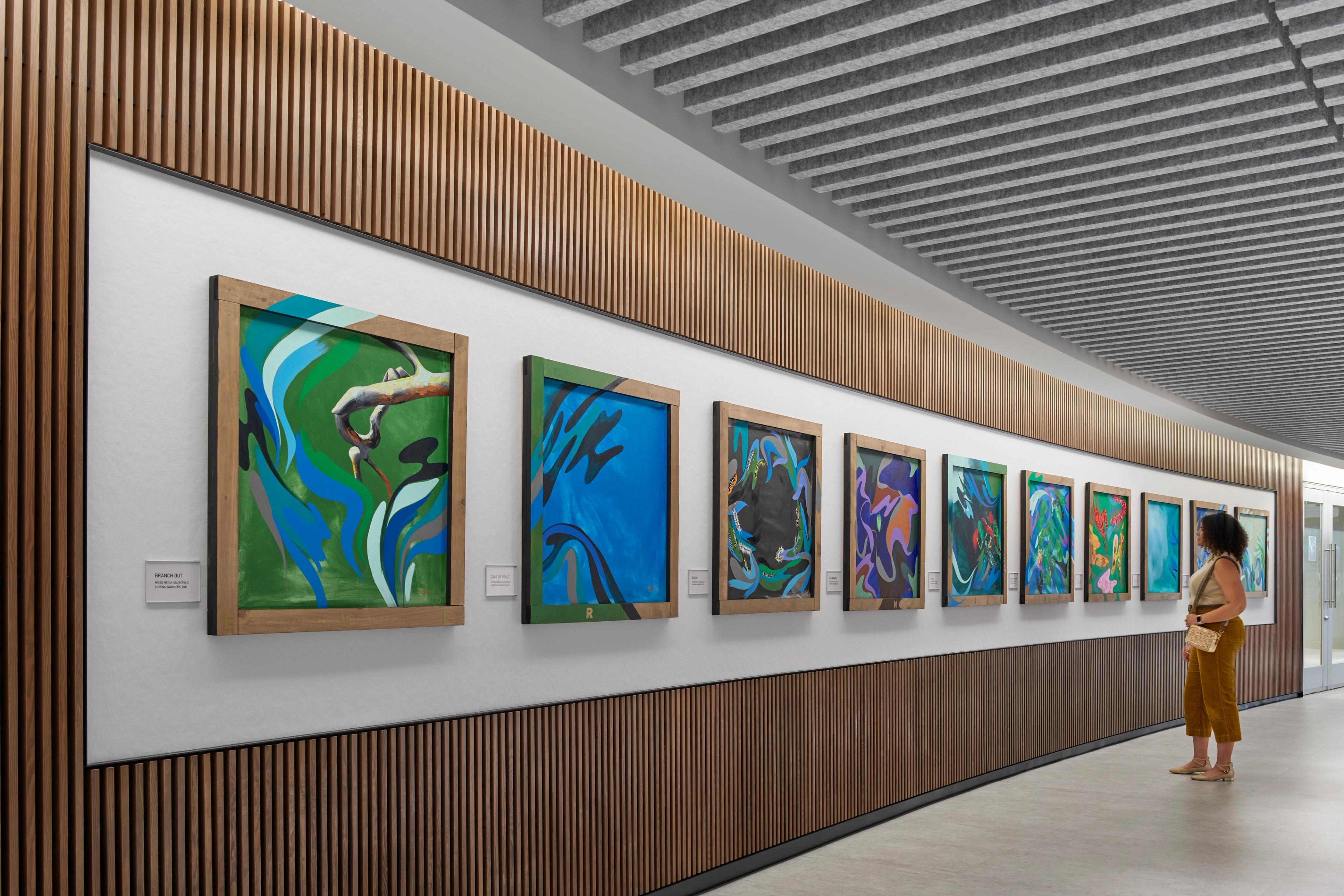 For better acoustics throughout the Independence Blue Cross Joseph A. Frick Conference and Learning Center, Meyer Design used our Micro Slab and Torrent baffles to line the ceilings. Employees and visitors will be immersed into quiet as they walk through the halls, allowing them to take in the surrounding art and focus on what the center has to offer.