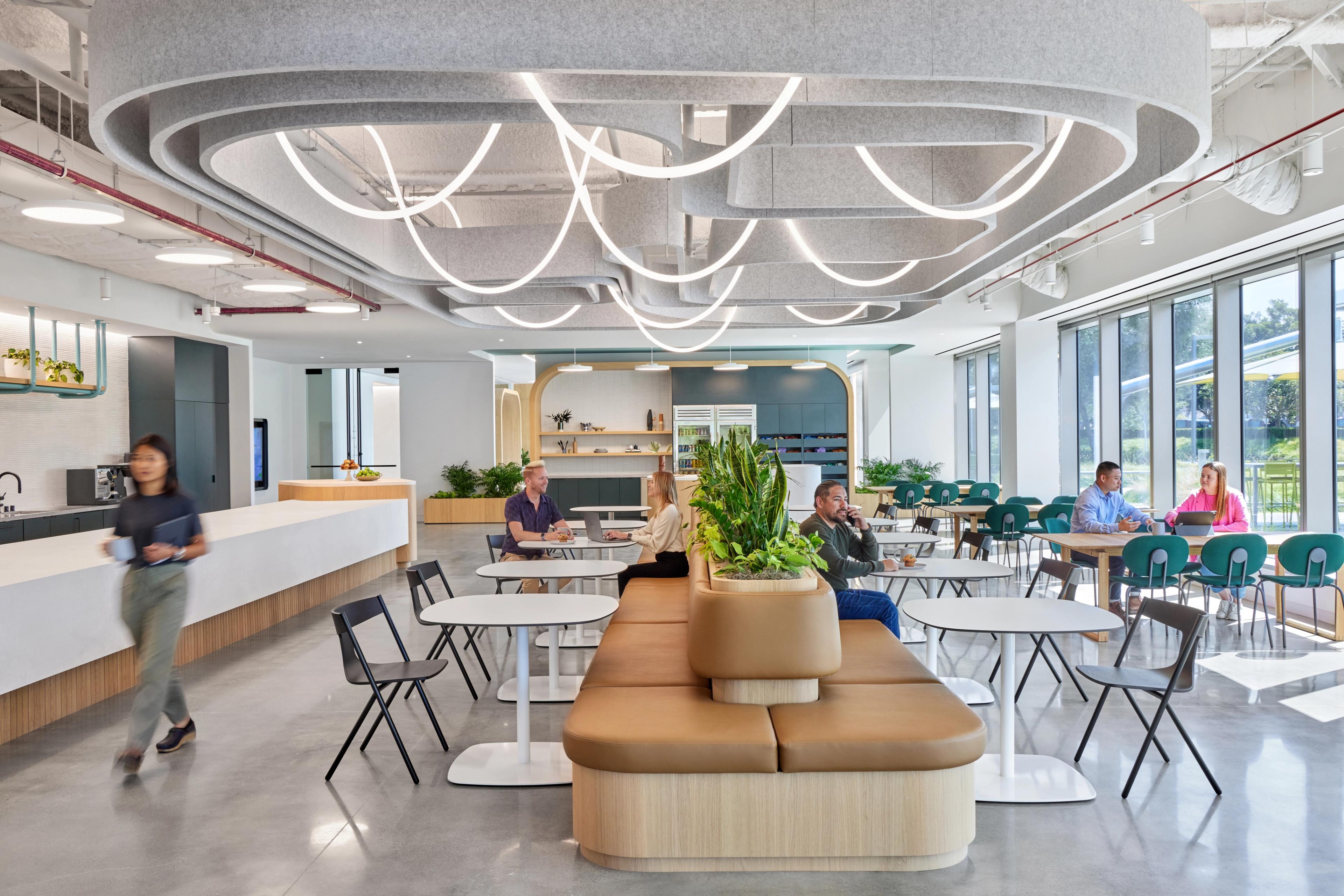 We teamed up with RMW to equip Supernal Waterworks’ new 80,000 SF office with our dynamic ceiling scapes and high-performance acoustics, adding to the modern workspace. Turf’s Drop baffles above the communal space mimic the organic flow of the sculptural light fixtures, creating a balanced and inviting atmosphere. A custom Freeform Ceiling Scape hangs over the café with ambient lighting to foster a collaborative atmosphere.