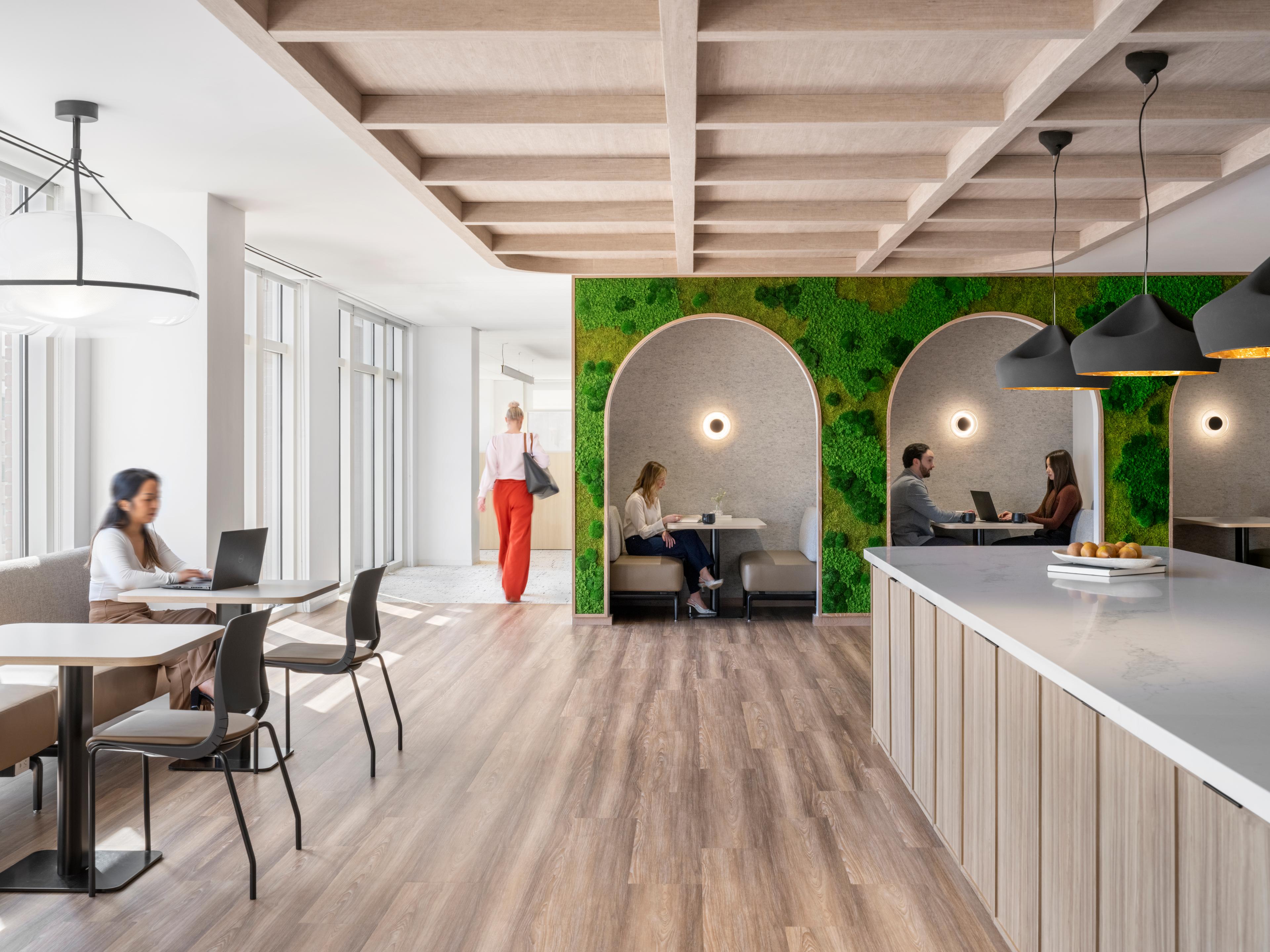 In collaboration with OTJ, we worked to dull the city noises of Boston in Weiss Asset Management’s office with our customized acoustic solutions. We designed Freeform to radius the corners of Plaid, with the neutral tones of Washed Ash on Latte to complement the biophilic elements of the office. This, along with the beautiful views of the Boston neighborhood, makes the office a calming and productive environment.
