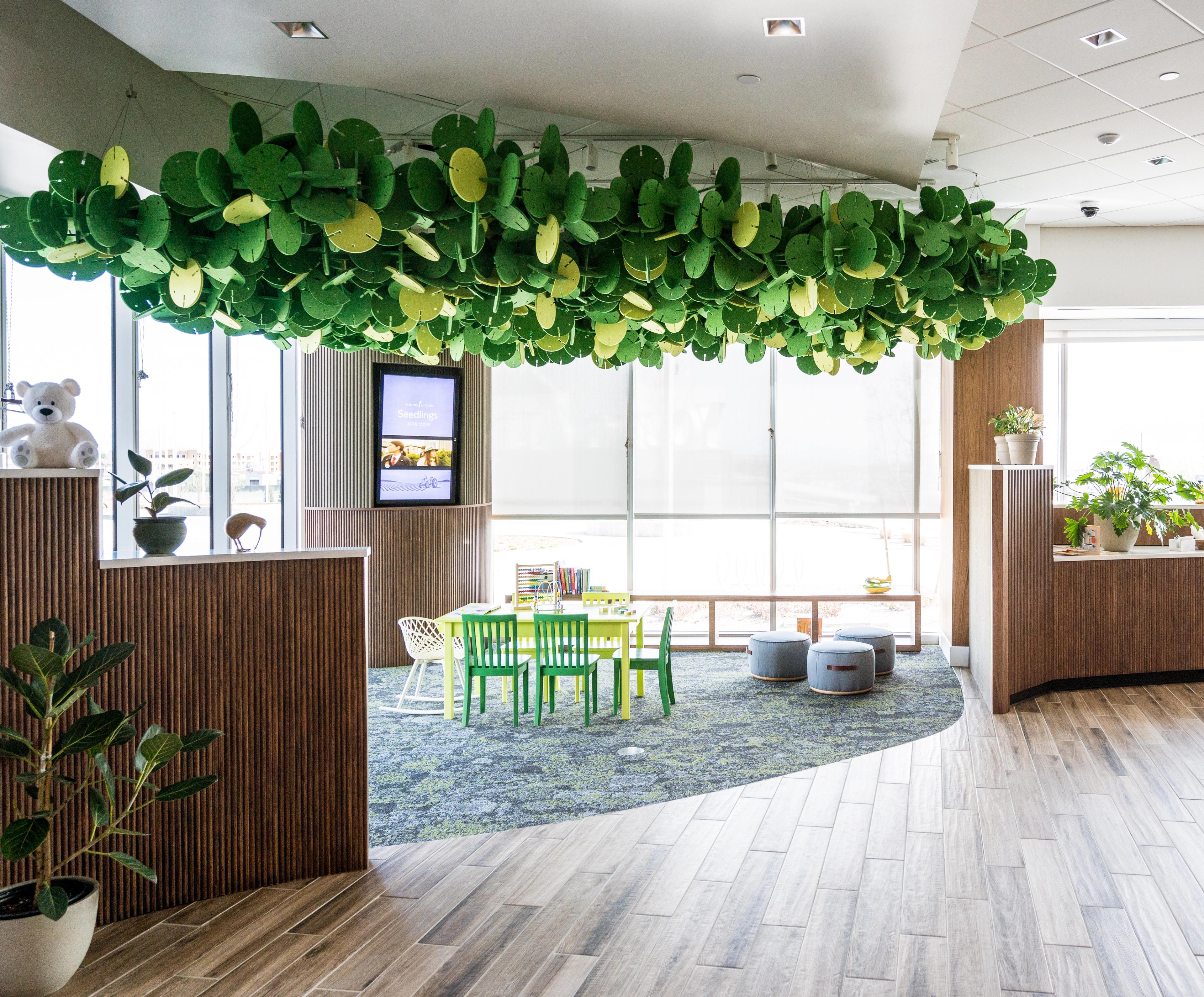 We partnered with Eden & Co Interior Design on a custom ceiling solution that captures the essence of Young Living in the companyโs Customer Experience Center. The acoustic system floating over the seating area adds vibrancy while softening the surrounding sound. With varying shades of green to blend in with the brand's earthy identity, visitors are immersed in the brand and the fragrance of their essential oils.